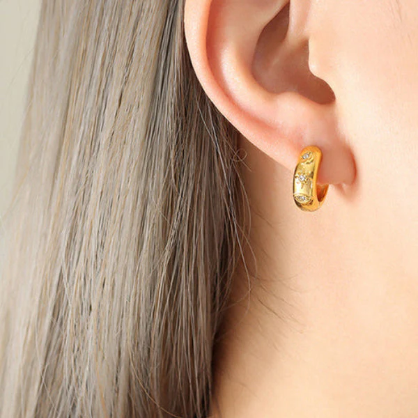 Huggie earrings with true Goddess appeal, featuring a star, moon and evil eye with rhinestone inlay.
