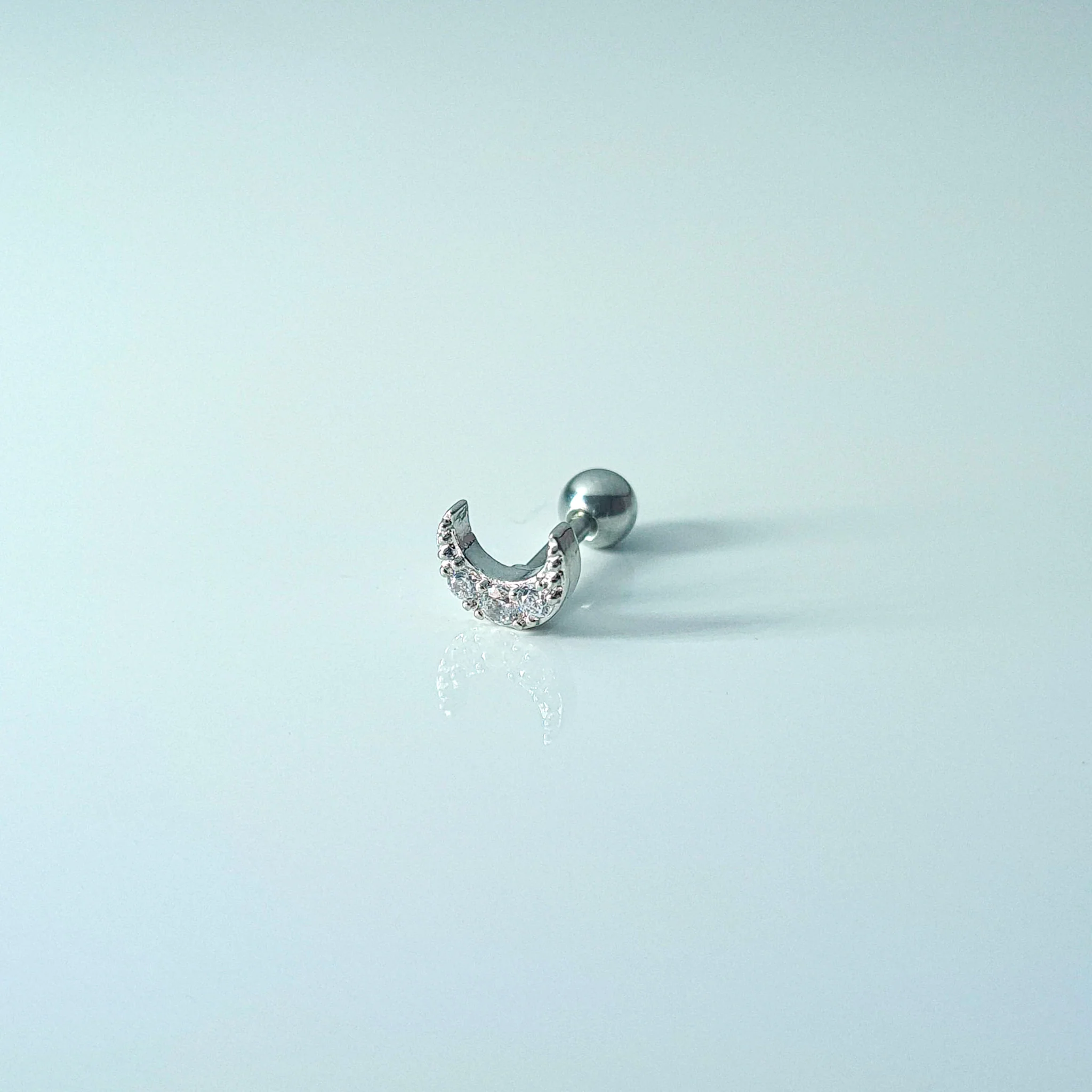 Moon shape single piercing stud set with cubic zirconia.